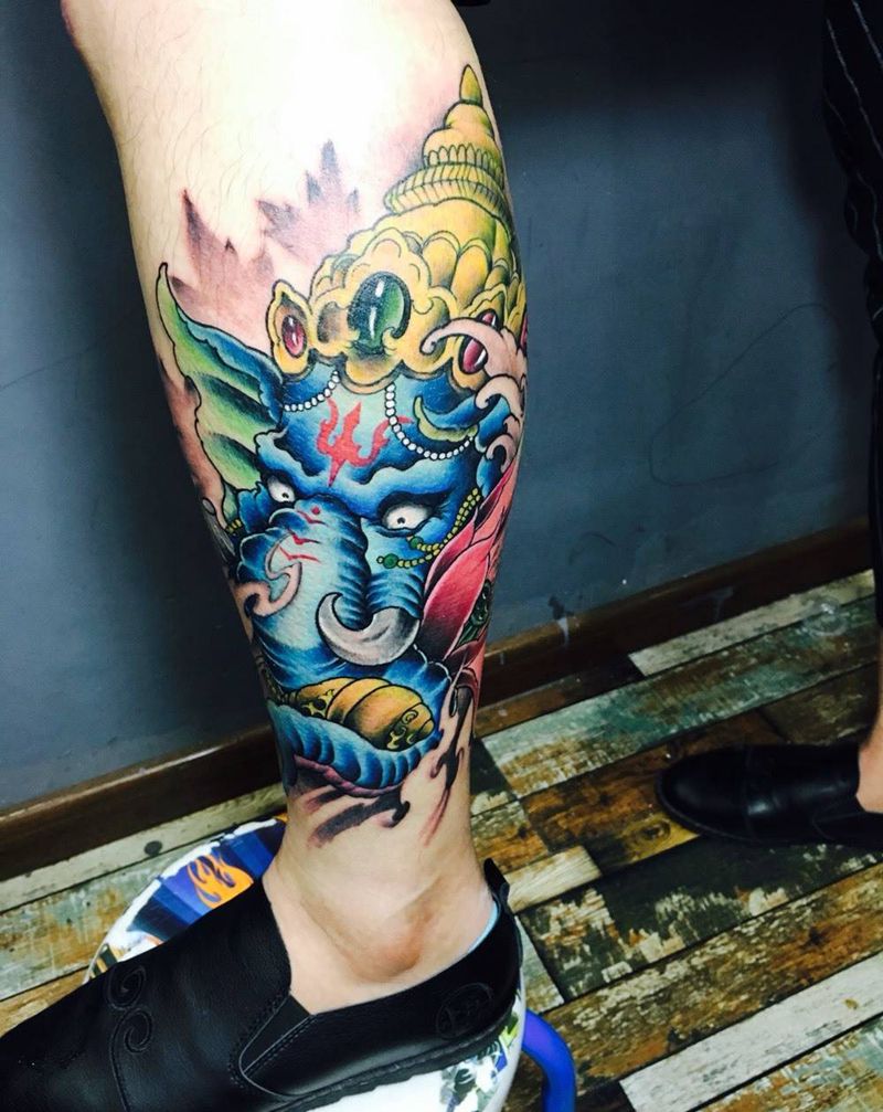 当前位置: 首页 >浙江省温州市纹身店-温州阿强纹身纹身图案>彩色象神纹身图片