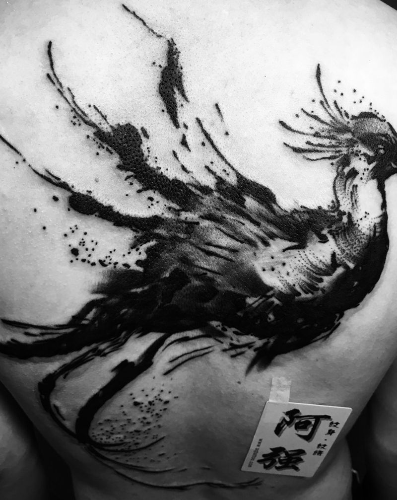 水墨凤凰纹身图片_成品背部国画动物纹身图案