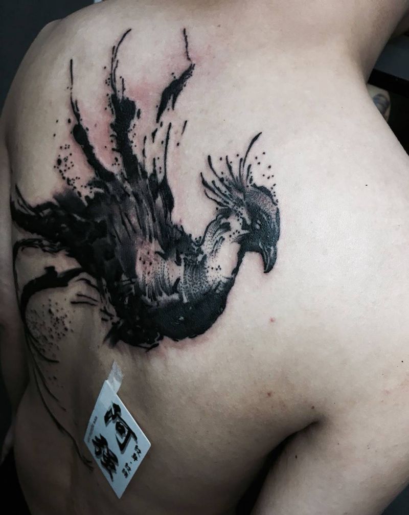 水墨凤凰纹身图片_成品背部国画动物纹身图案