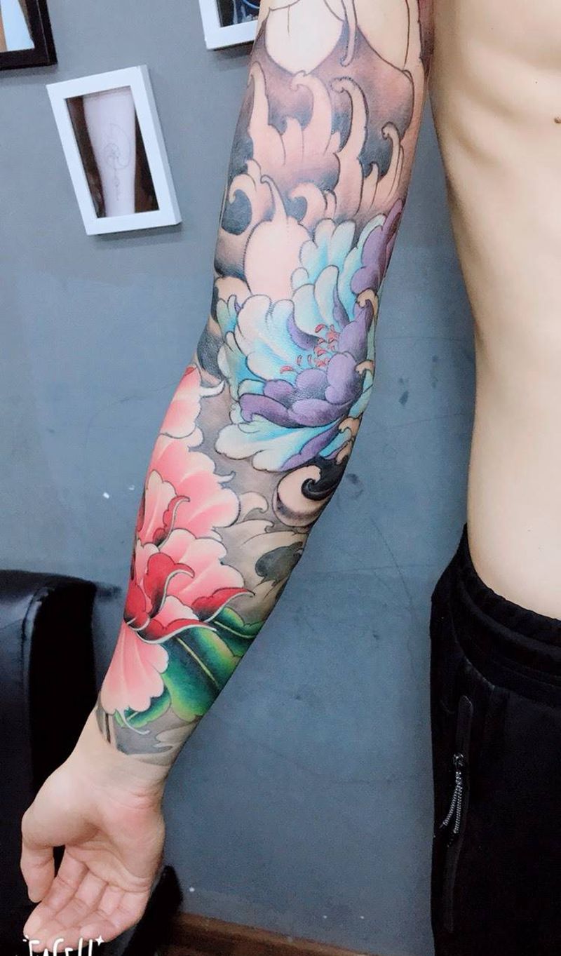 重彩花臂纹身图片_成品手臂传统植物花臂纹身图案