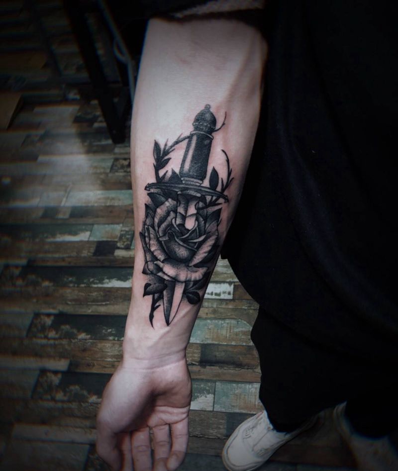 当前位置: 首页 >浙江省温州市纹身店-温州阿强纹身纹身图案>匕首玫瑰花纹身图片