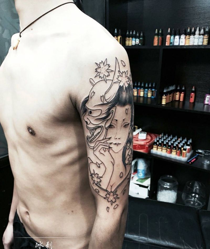 当前位置: 首页 >浙江省宁波市纹身店-无风格纹身工作室纹身图案>大臂艺妓纹身图片_手臂肖像传统人物纹身图案