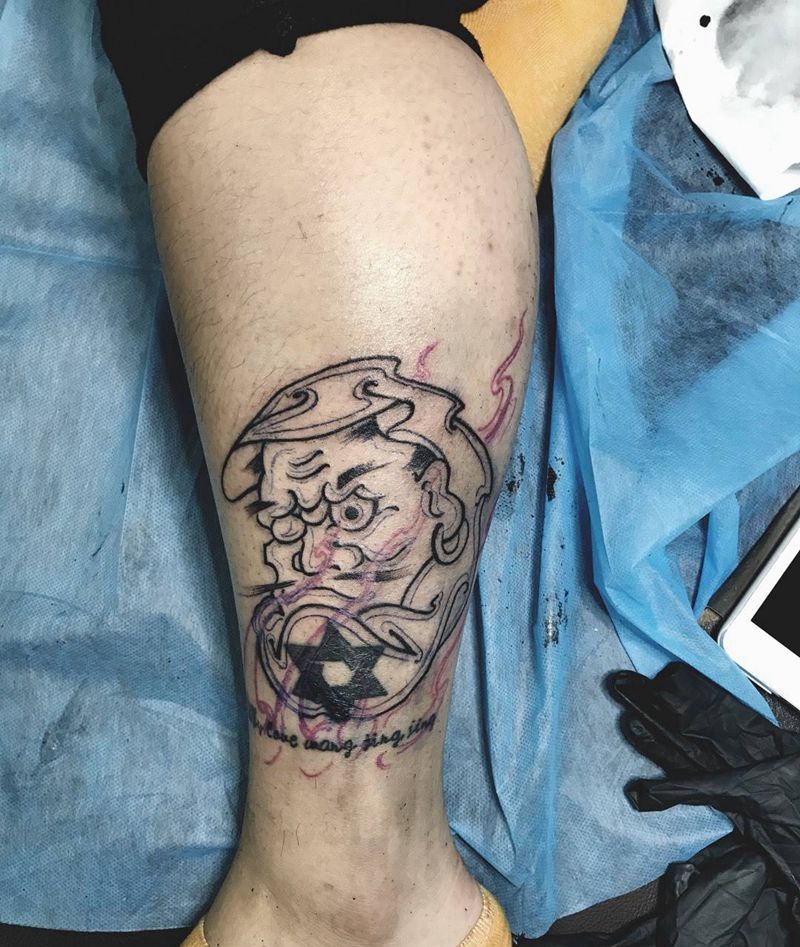 • T包小腿吹火男+阿多福纹身图片_腿部老传统新传统吹火男阿