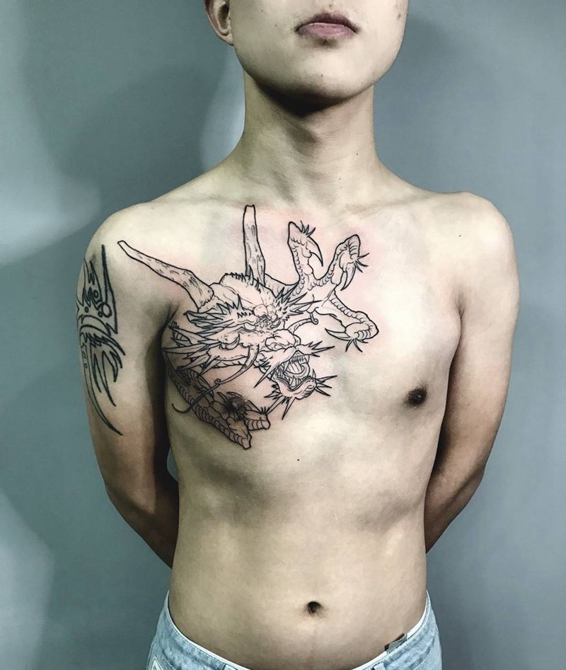当前位置: 首页 >浙江省宁波市纹身店-无风格纹身工作室纹身图案>胸口龙头线纹身图片_成品胸部传统鬼神纹身图案