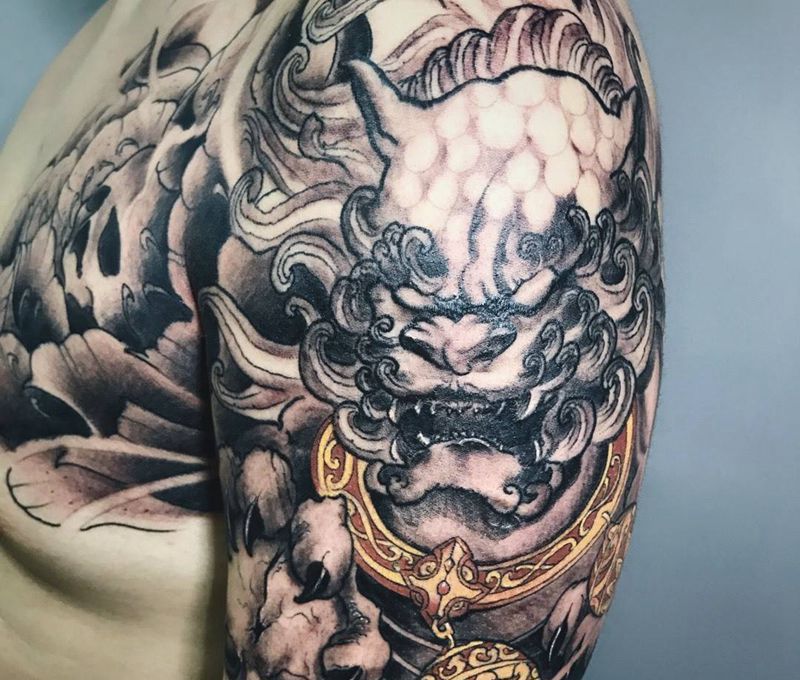 唐狮牡丹纹身图片_成品手臂胸部传统鬼神动物纹身图案