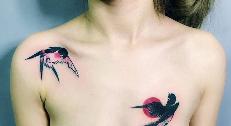 当前位置: 首页 >浙江省宁波市纹身店-无风格纹身工作室纹身图案>双飞燕纹身图片_成品胸部清新传统动物静物纹身图案