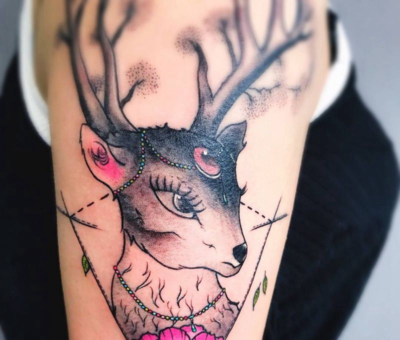 当前位置: 首页 >浙江省宁波市纹身店-无风格纹身工作室纹身图案>驯鹿纹身图片_成品手臂传统清新动物纹身图案