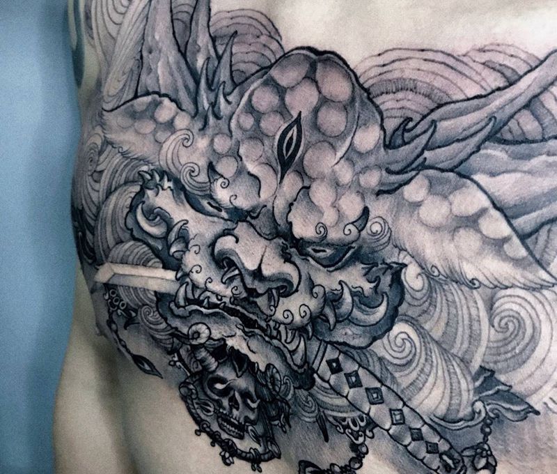 唐狮纹身图片_成品胸部传统鬼神纹身图案