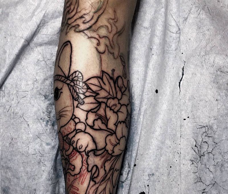 当前位置: 首页 >浙江省宁波市纹身店-无风格纹身工作室纹身图案>线纹身图片_成品腿部传统动物人物鬼神纹身图案