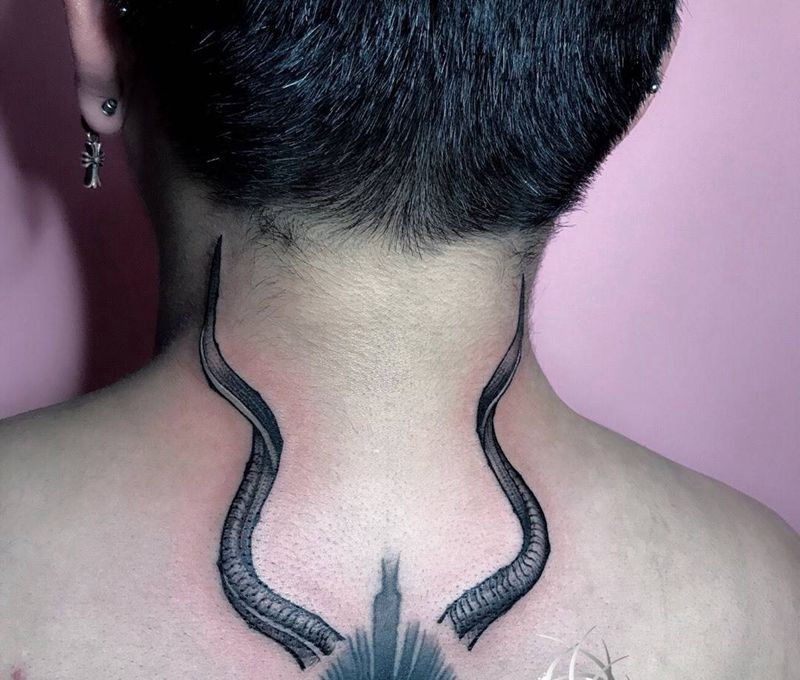 当前位置: 首页 >浙江省宁波市纹身店-无风格纹身工作室纹身图案>角纹身图片_颈部纹身图案