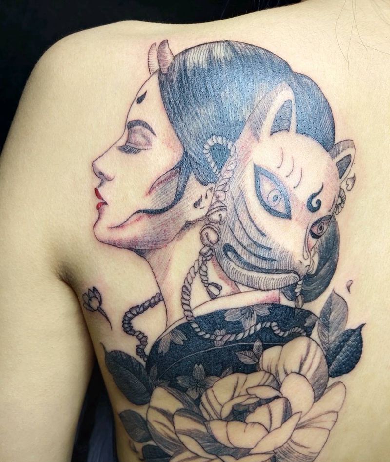 当前位置: 首页 >浙江省宁波市纹身店-念·刺青纹身图案>艺伎纹身图片_肩部背部新传统欧美写实美女花面具纹身图案