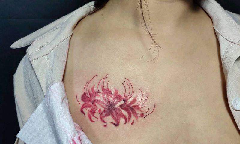 彼岸花纹身图片_胸部肩部水彩欧美写实彼岸花纹身图案