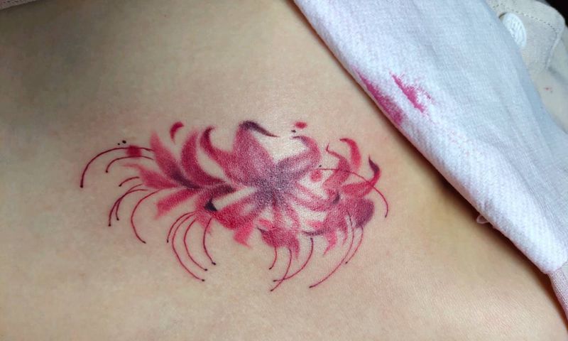 当前位置: 首页 >浙江省宁波市纹身店-念·刺青纹身图案>彼岸花纹身图片_胸部肩部水彩欧美写实彼岸花纹身图案
