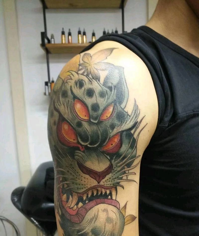 • T网红王老大花腿龙纹身图片_腿部新传统纹身图案