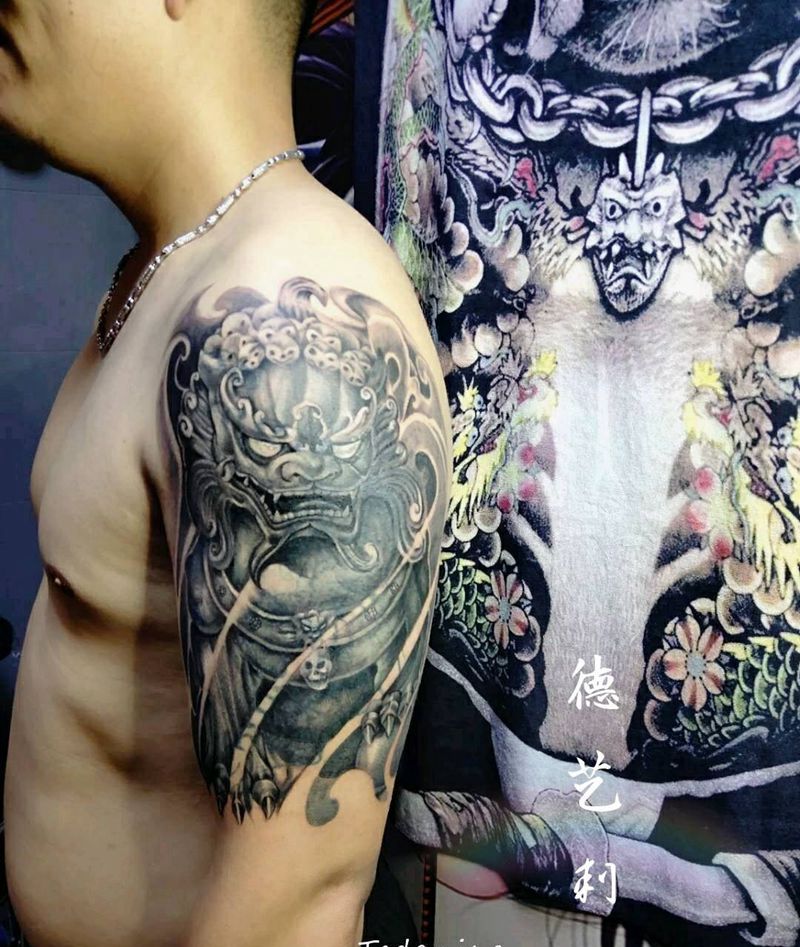 遮盖旧图纹身图片_手臂欧美写实唐狮纹身图案