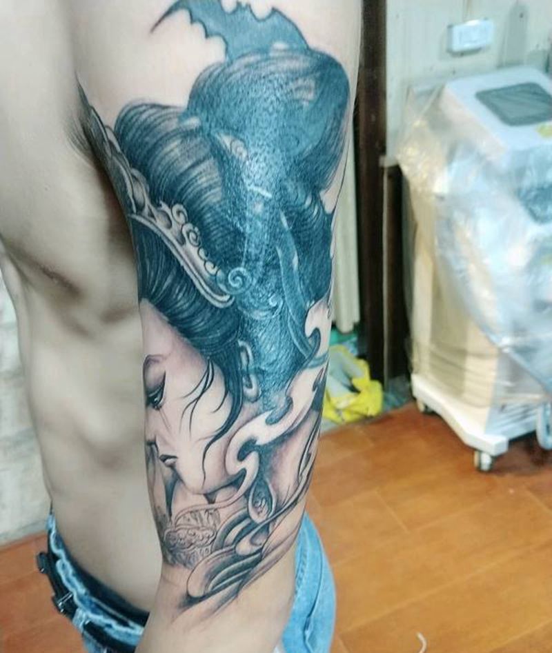 当前位置: 首页 >浙江省温州市纹身店-南唐刺青纹身图案>艺妓遮盖大图纹身图片_手臂新传统纹身图案