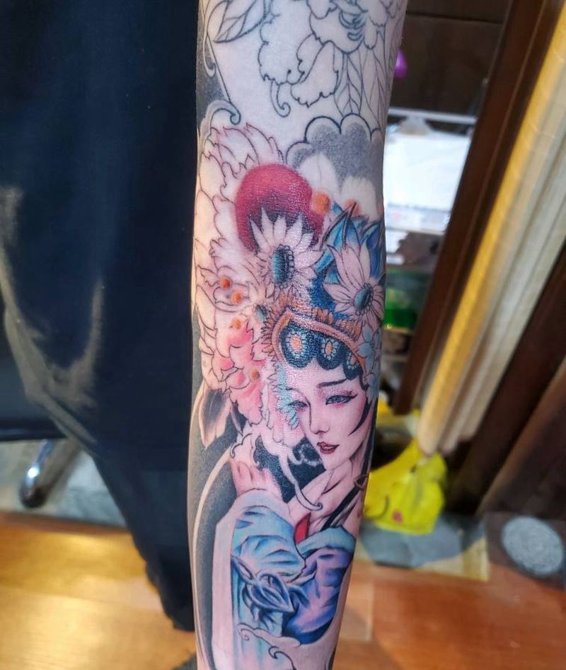 当前位置: 首页 >浙江省温州市纹身店-南唐刺青纹身图案>日式板雾配中国风花旦纹身图片_手臂新传统老传统纹身图案