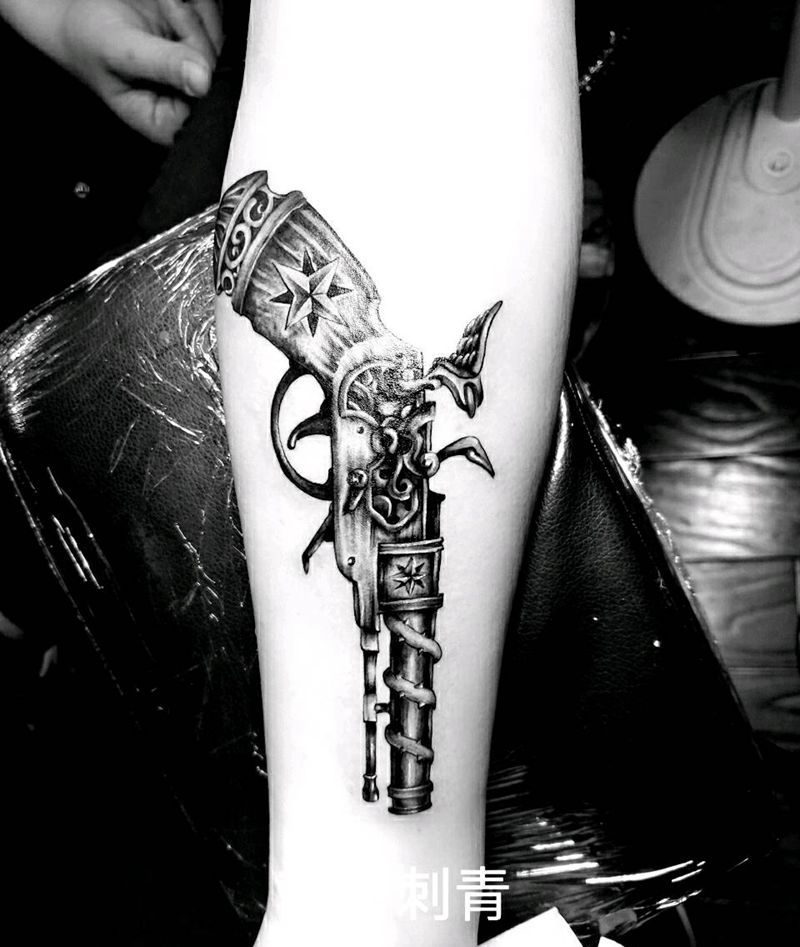 当前位置: 首页 >浙江省温州市纹身店-南唐刺青纹身图案>火枪纹身图片_手臂欧美写实纹身图案