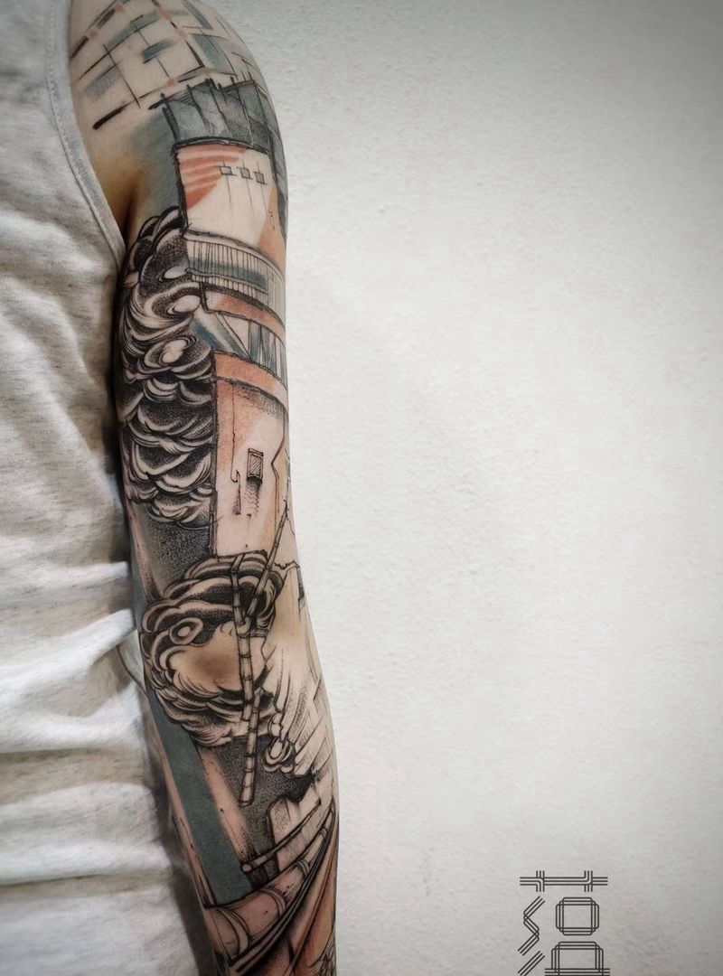 当前位置: 首页 >浙江省温州市纹身店-蕴刺青纹身图案>崩塌的城市纹身图片_手臂手部New School建筑速写现代纹身图案