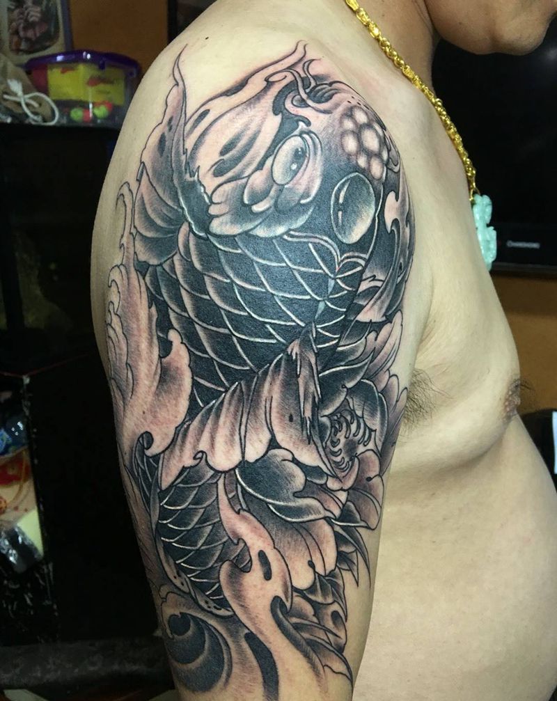 鲤鱼遮盖老图。耗时三小时纹身图片