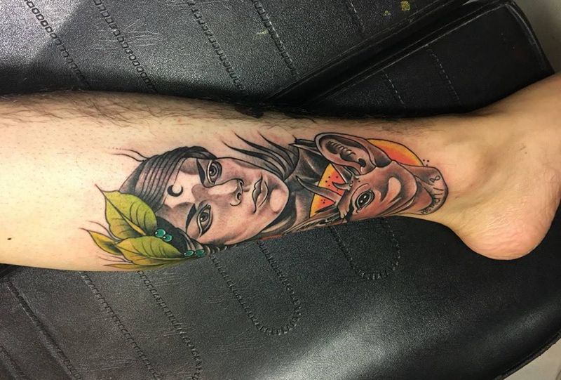 • T包小腿吹火男+阿多福纹身图片_腿部老传统新传统吹火男阿