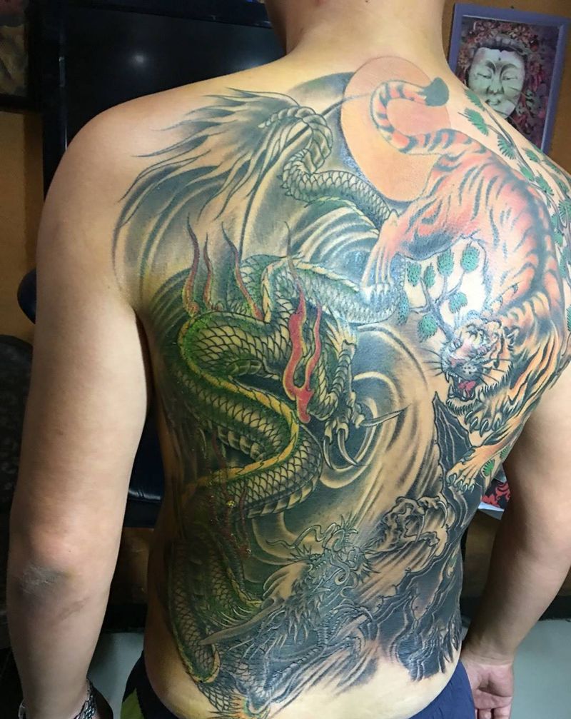 当前位置: 首页 >浙江省温州市纹身店-道格刺青纹身图案>添加满背,修改老虎。龙虎斗完成,耗时14小时。纹身图片