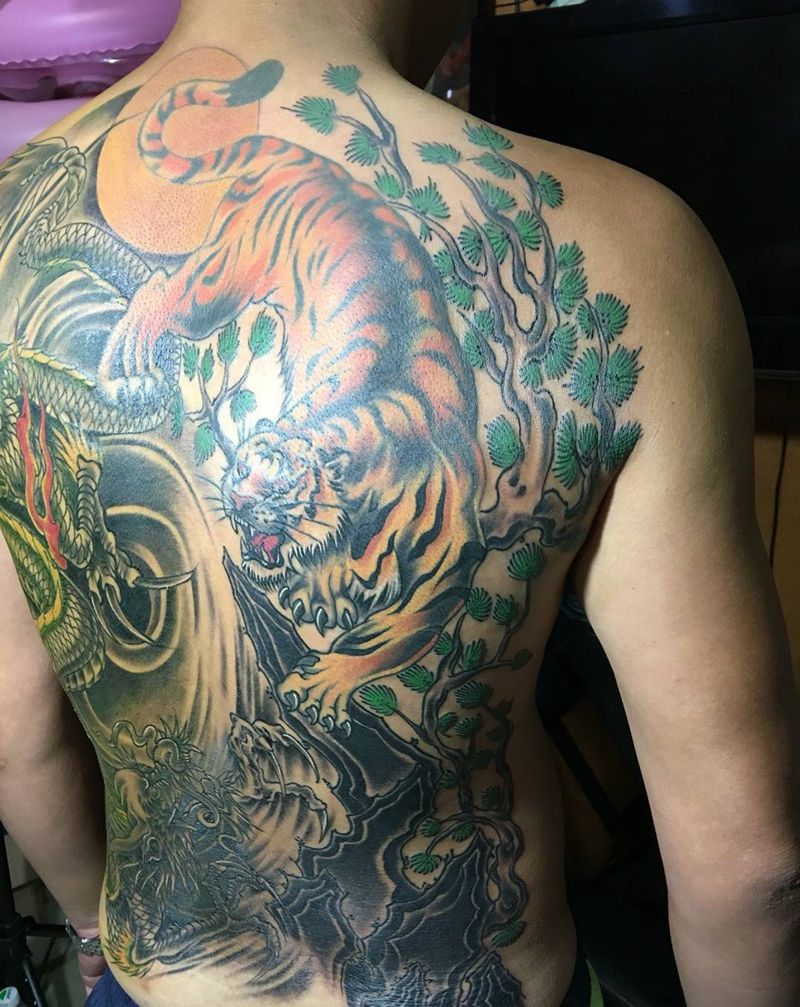 添加满背,修改老虎。龙虎斗完成,耗时14小时。纹身图片