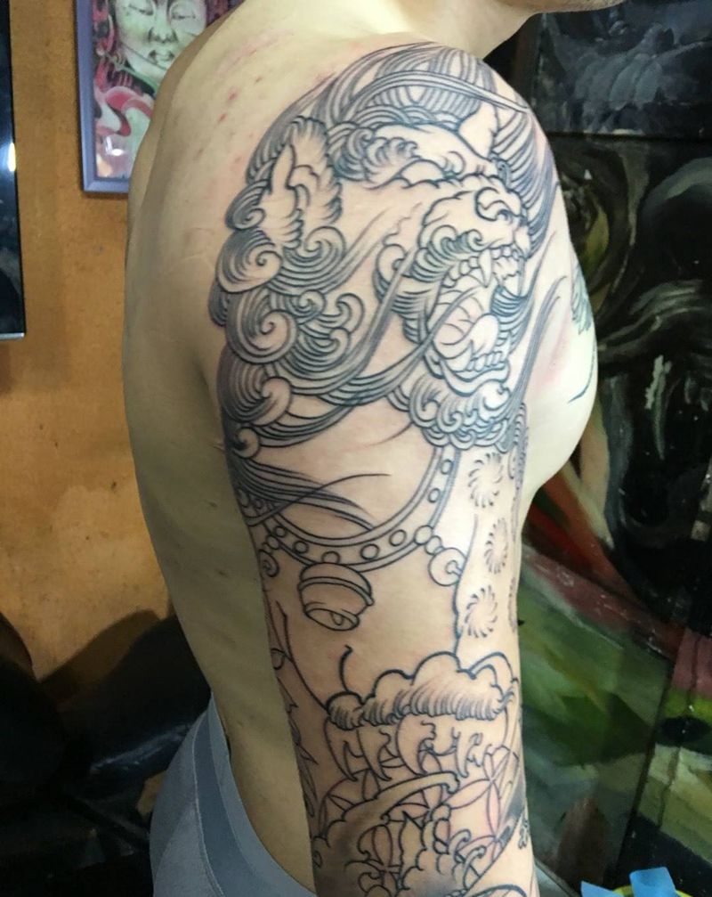当前位置: 首页 >浙江省温州市纹身店-道格刺青纹身图案>唐狮鲤鱼花臂,纹身图片