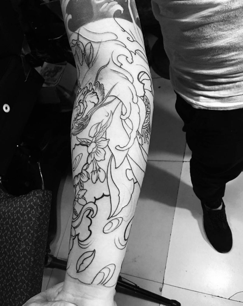当前位置: 首页 >浙江省温州市纹身店-道格刺青纹身图案>衔接花臂。纹身图片