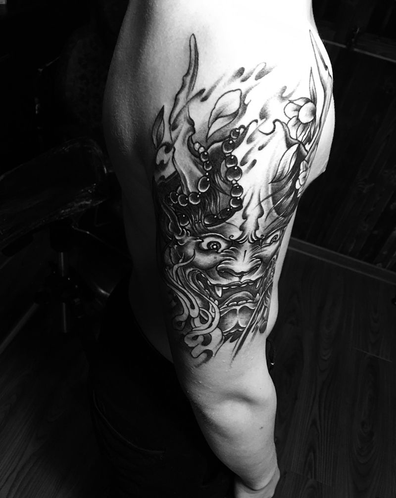 • T网红王老大花腿龙纹身图片_腿部新传统纹身图案