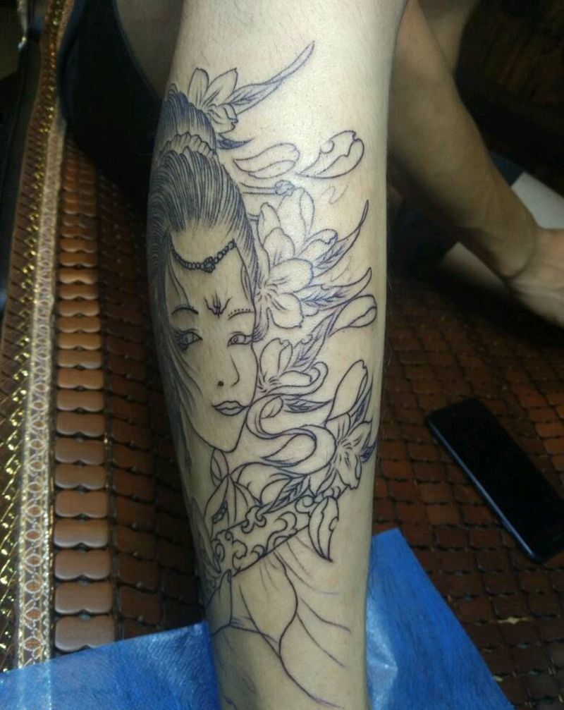 小腿艺妓勾线纹身图片