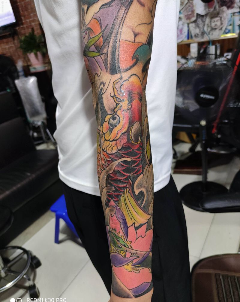 当前位置: 首页 >浙江省温州市纹身店-温州魔刺魂纹身-魔窟纹身纹身图案>花臂彩色 艺妓 锦鲤上色纹身图片_手臂腿部老传统新传统纹身图案