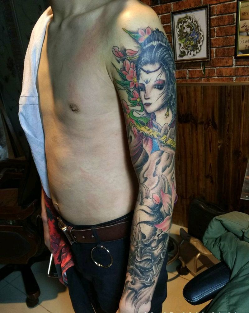 当前位置: 首页 >浙江省温州市纹身店-温州魔刺魂纹身-魔窟纹身纹身图案>花臂艺妓班诺纹身图片