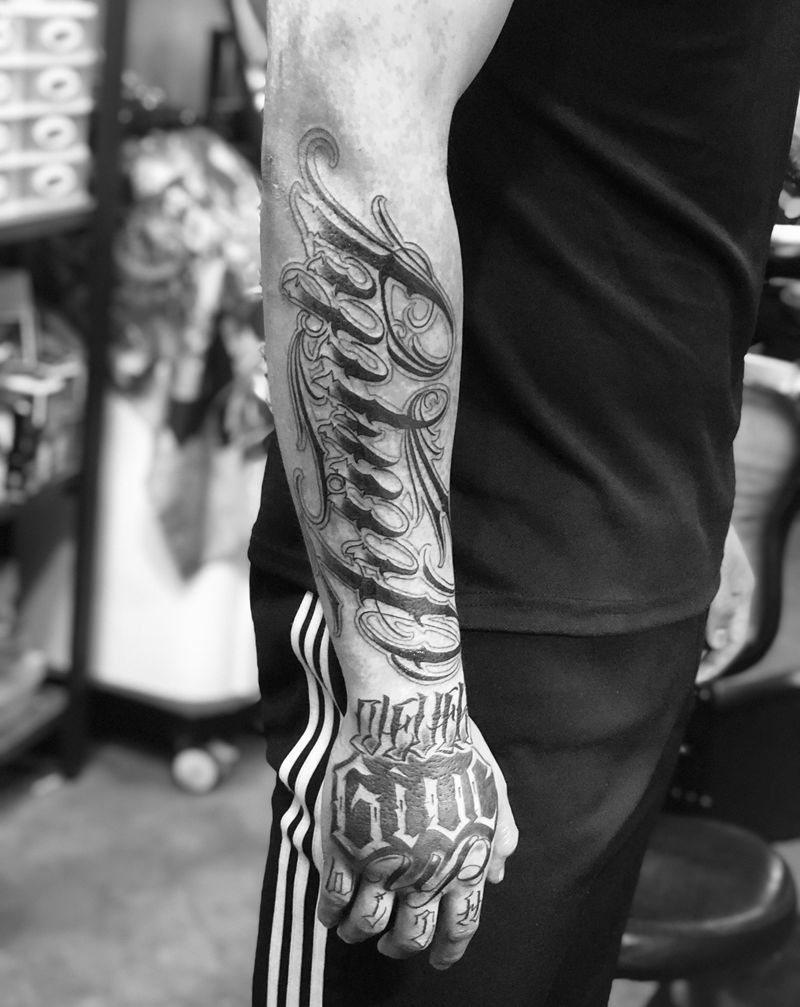当前位置: 首页 >浙江省温州市纹身店-G刺青纹身图案>花体字纹身图片_手臂手部花体字纹身图案