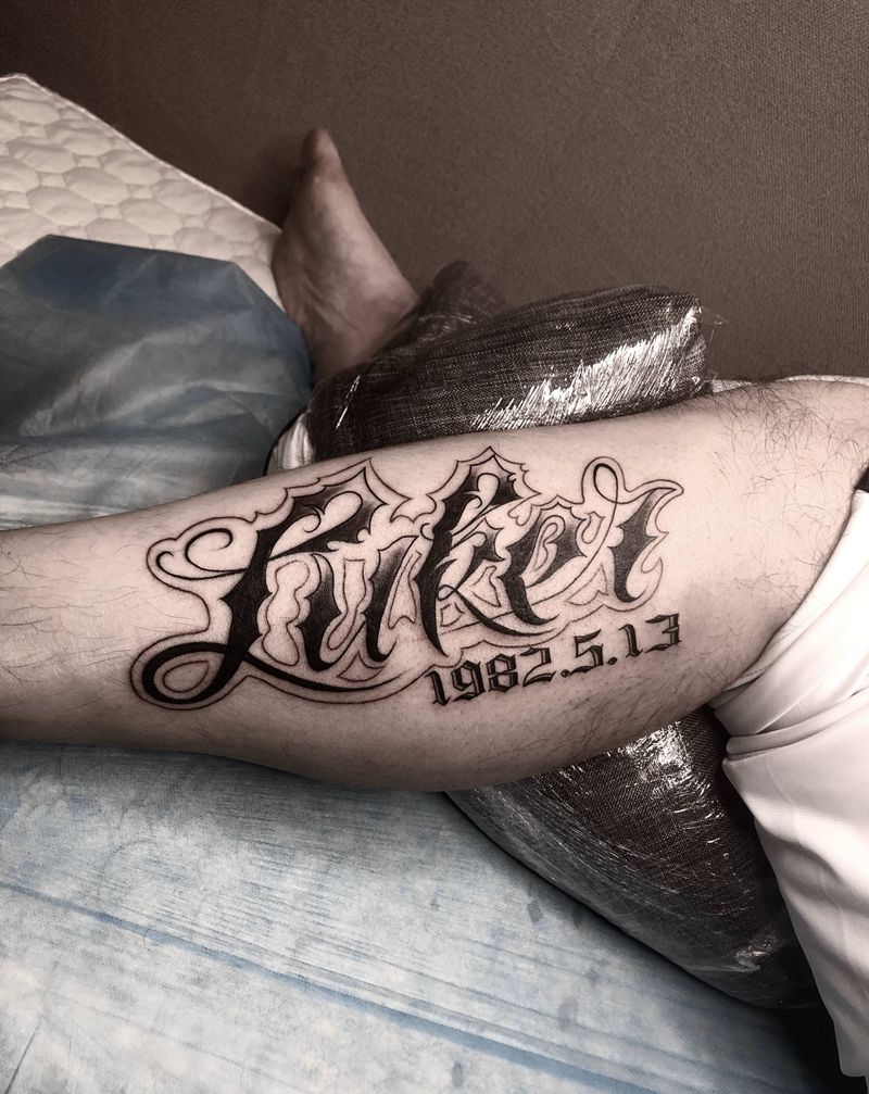名字纹身图片_腿部花体字纹身图案