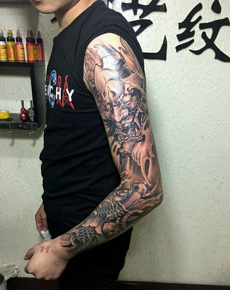 当前位置: 首页 >浙江省温州市纹身店-芸艺纹身纹身图案>黑灰花臂 大臂遮盖疤痕纹身图片