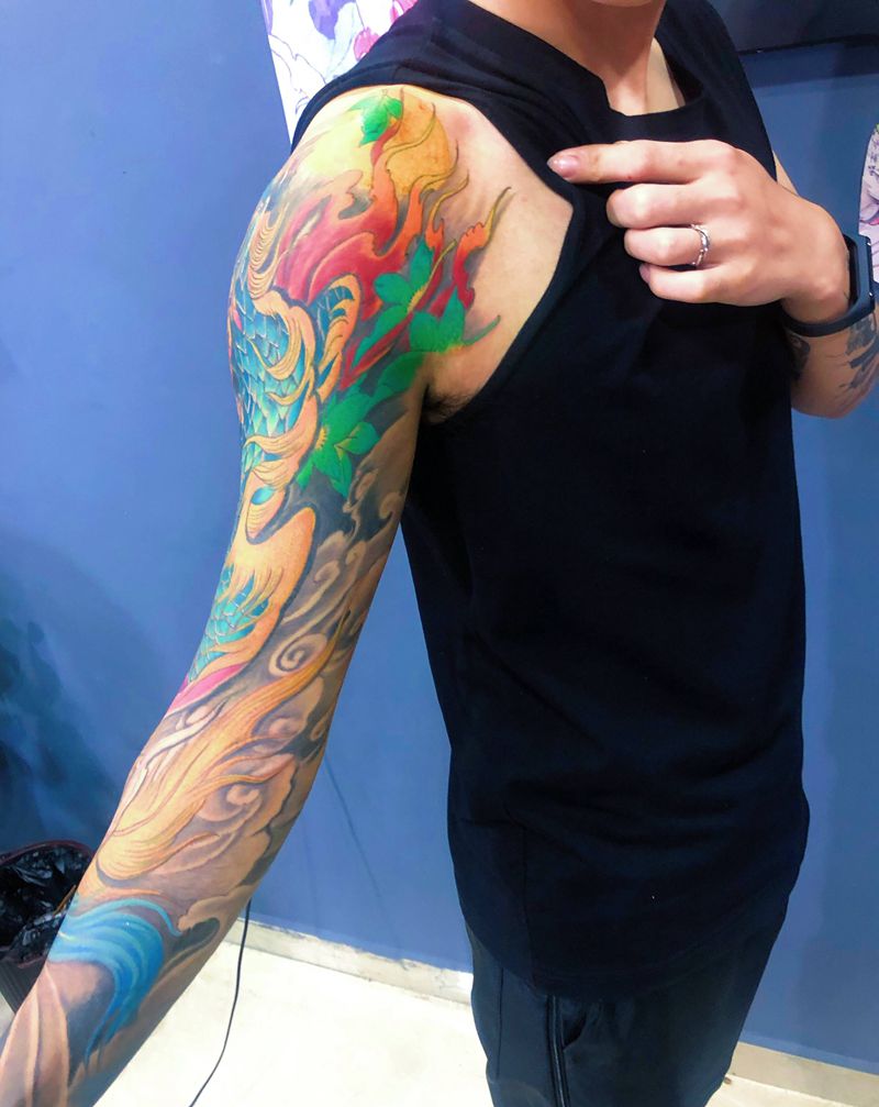 当前位置: 首页 >浙江省温州市纹身店-芸艺纹身纹身图案>重彩花臂凤凰纹身图片_手臂新传统凤凰纹身图案