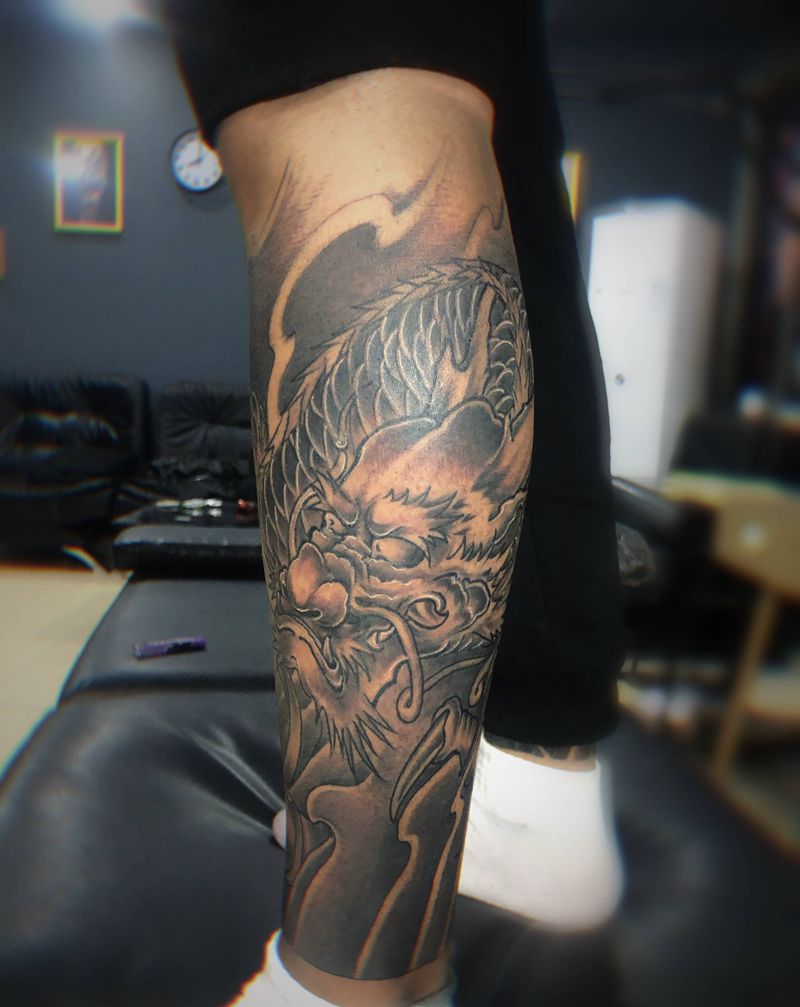 • T网红王老大花腿龙纹身图片_腿部新传统纹身图案