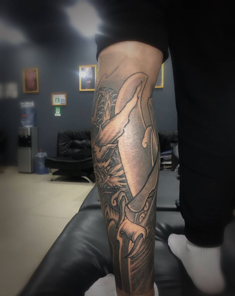 • T网红王老大花腿龙纹身图片_腿部新传统纹身图案