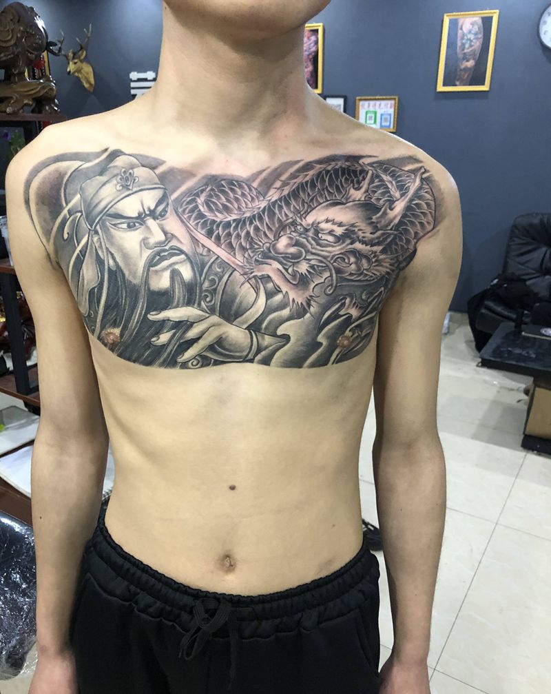 花胸完成纹身图片_胸部新传统关公 龙龙纹身图案