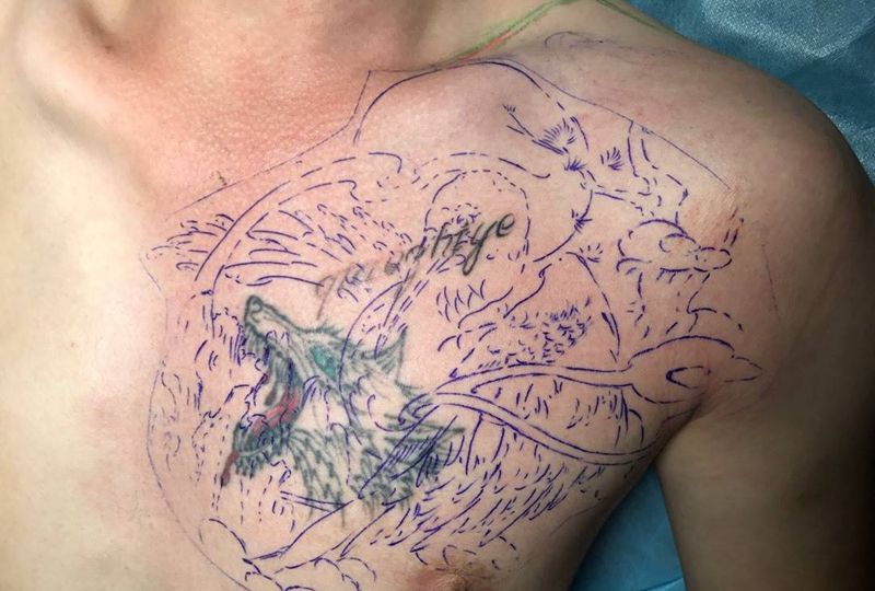 当前位置: 首页 >浙江省温州市纹身店-董玮刺青纹身图案>遮盖老式狼头.仙鹤纹身图片
