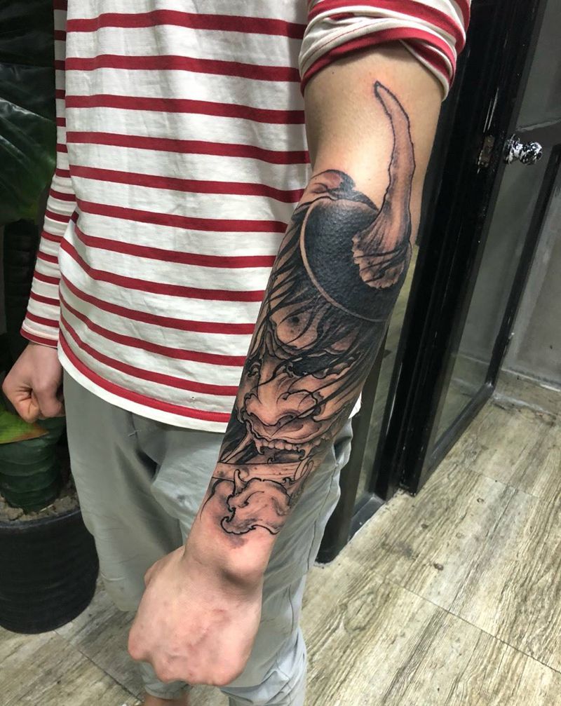 当前位置: 首页 >浙江省嘉兴市纹身店-嘉兴隐客刺青纹身图案>般纹身图片_成品手臂传统人物鬼神纹身图案