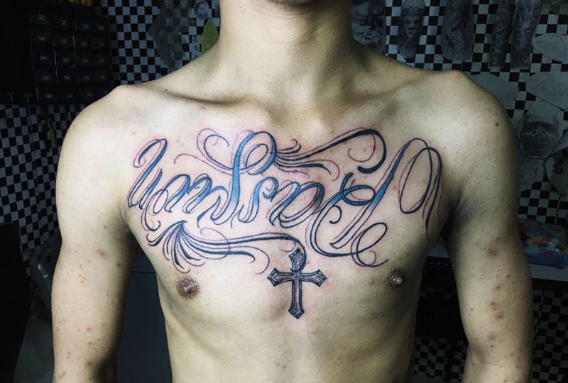 齐卡诺花体花胸纹身图片_胸部新传统花体字纹身图案
