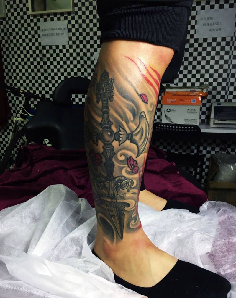 当前位置: 首页 >浙江省嘉兴市纹身店-万里刺青纹身图案>不动明王➕降魔杵包小腿纹身图片