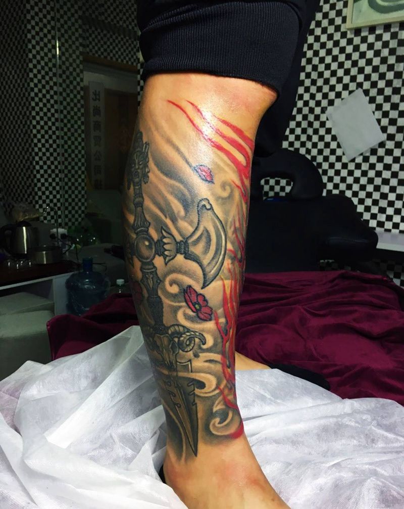 当前位置: 首页 >浙江省嘉兴市纹身店-万里刺青纹身图案>不动明王➕降魔杵包小腿纹身图片