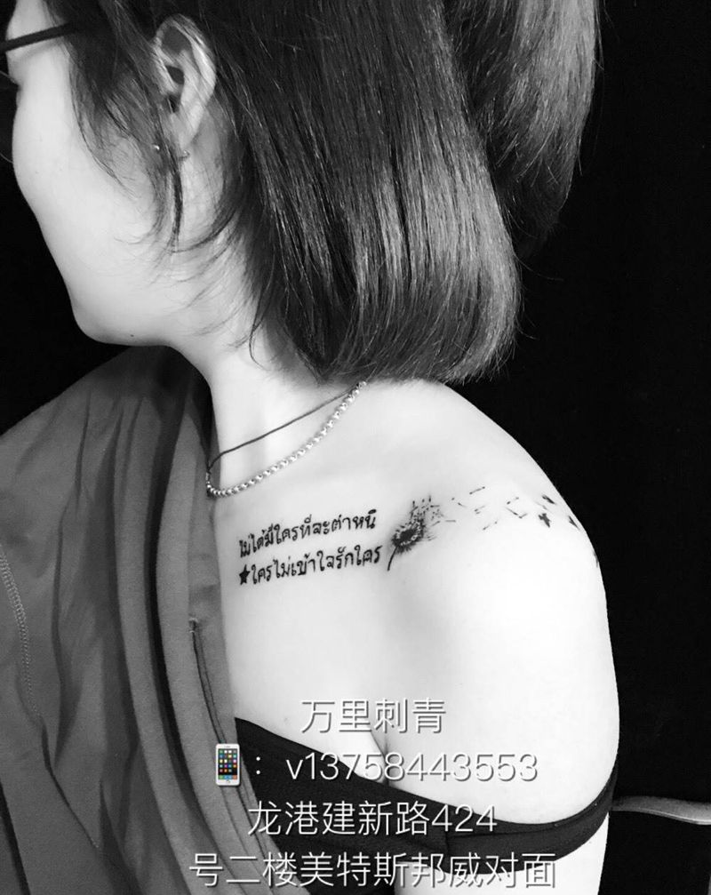 当前位置: 首页 >浙江省嘉兴市纹身店-万里刺青纹身图案>泰文+蒲公英纹身图片