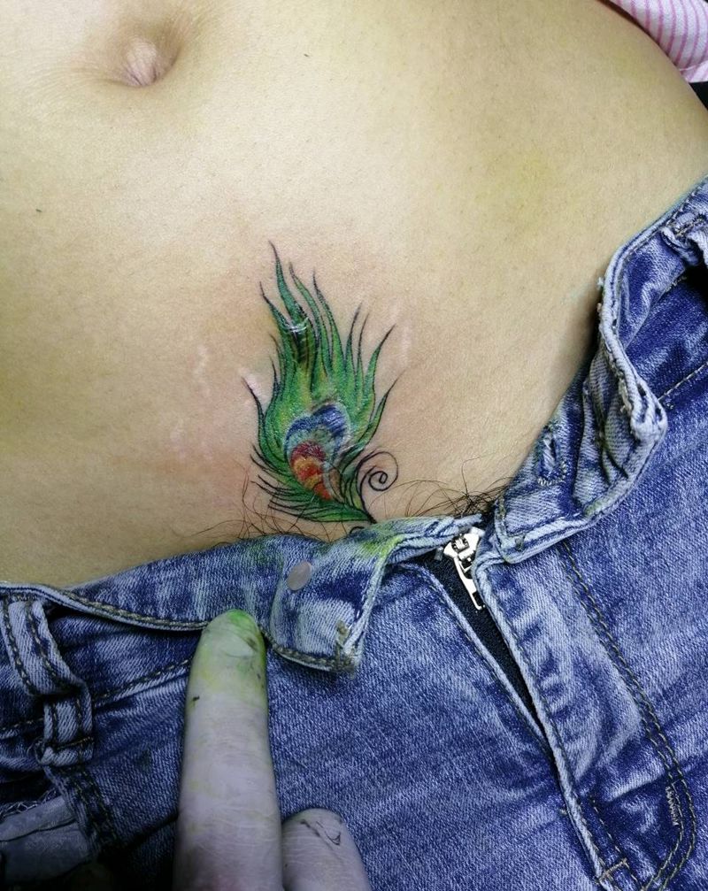 羽毛遮盖伤疤纹身图片_腹部纹身图案