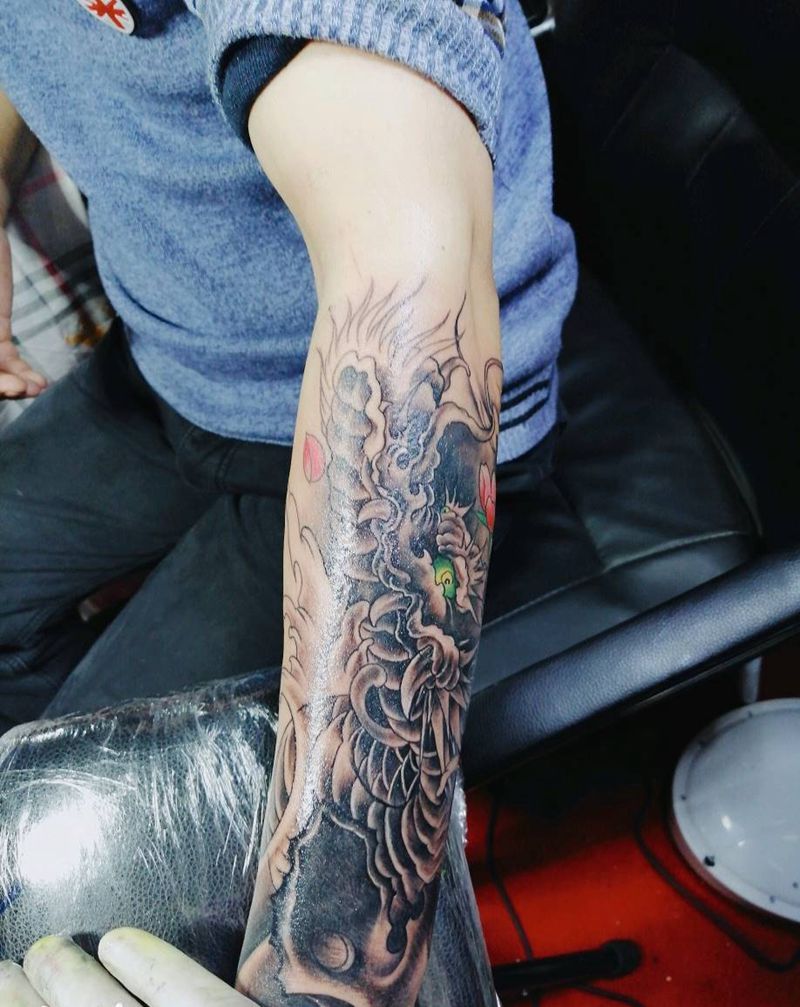 • T网红王老大花腿龙纹身图片_腿部新传统纹身图案