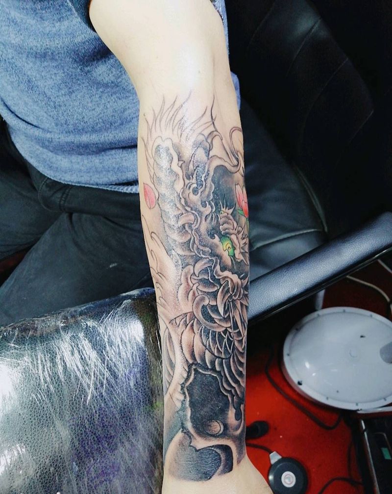 • T网红王老大花腿龙纹身图片_腿部新传统纹身图案