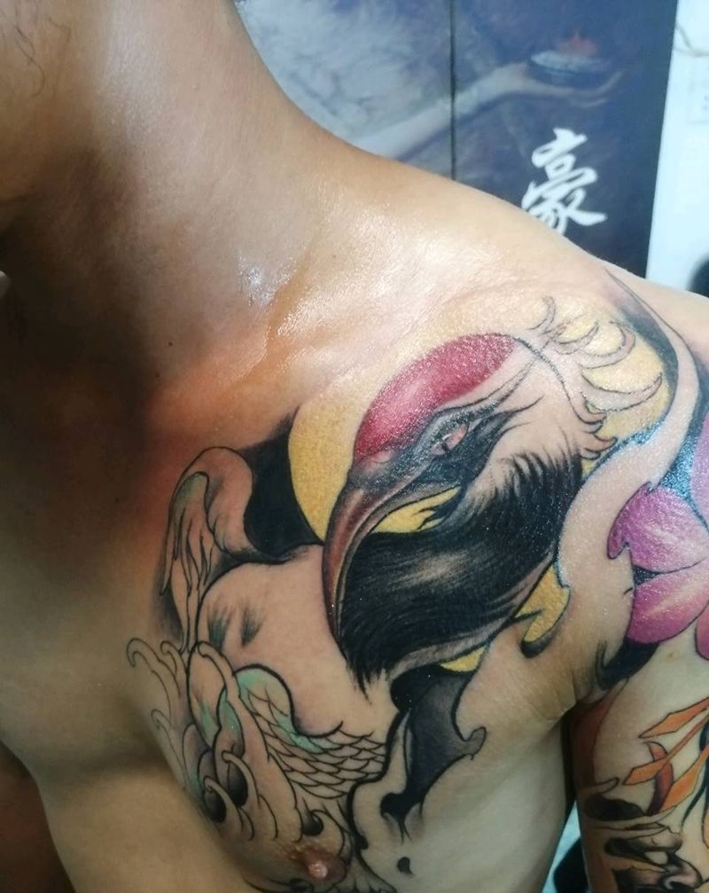 仙鹤艺妓上完色之后纹身图片_胸部手臂新传统纹身图案
